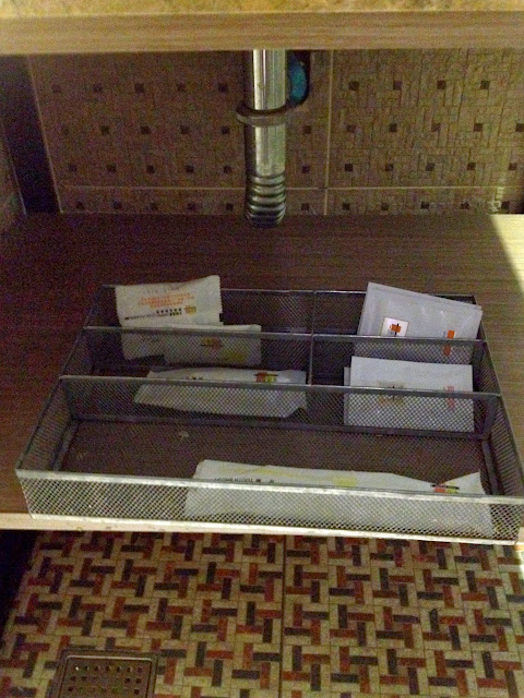 洗手台下方,有一盒裝著洗澡用品,洗澡、洗頭髮的、牙刷都有(兩人份) 廠牌是不知名的廠牌
